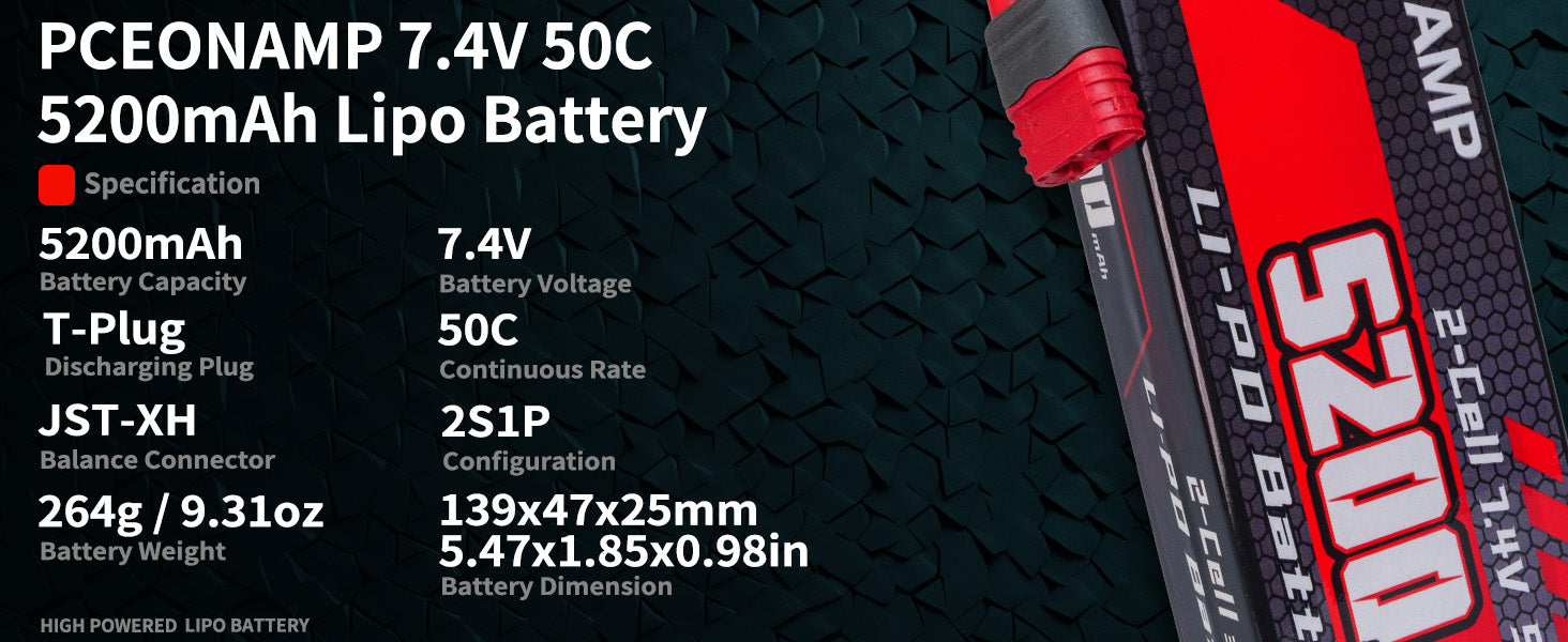 Specification: Dimensions: 139 x 47 x 25mm/5.47 x 1.85 x 0.98in; Weight: 264g/9.31oz; Capacity: 5200mAh; Voltage: 7.4V; Discharge C-rate: 50C; Plug: T Plug.