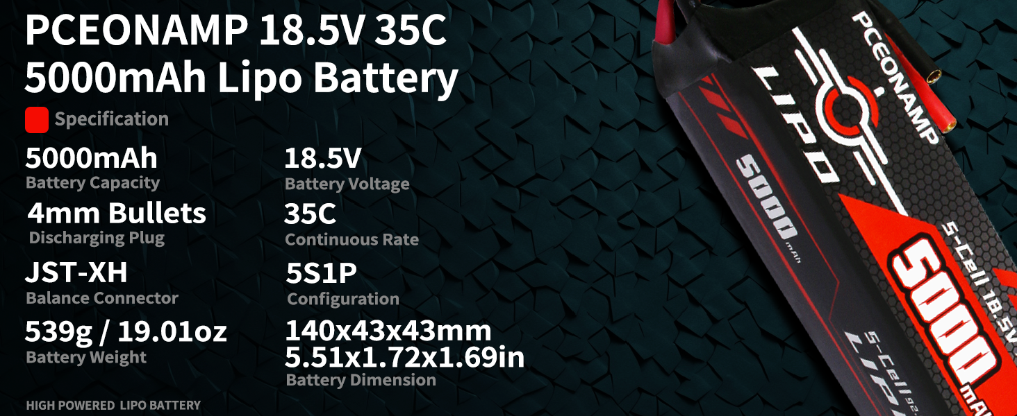 Specification: Dimensions: 140 x 43 x 43mm/5.5 x 1.72 x 1.72in; Weight: 539g/19.01oz; Capacity: 5000mAh; Voltage: 18.5V; Discharge C-rate: 35C; Plug: 4mm Bullets Plug.