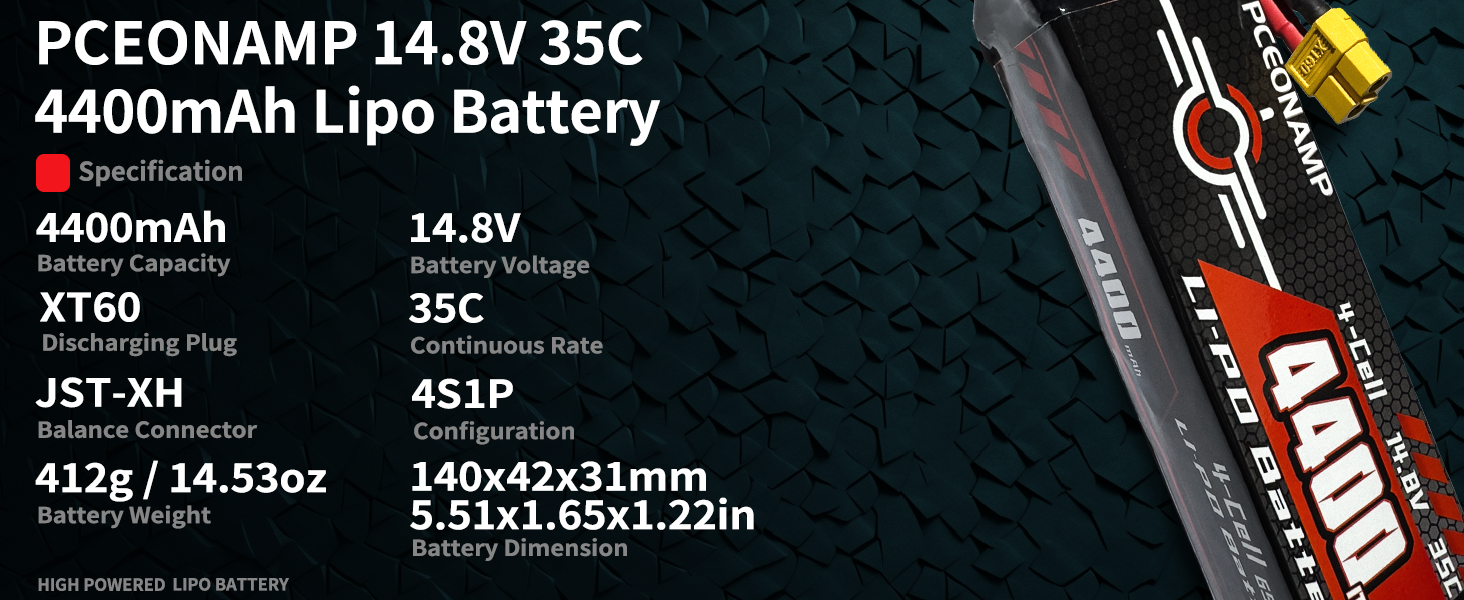 Specification: Dimensions: 140 x 42 x 31mm/5.5 x 1.65 x 1.22in; Weight: 412g/14.53oz; Capacity: 4400mAh; Voltage: 14.8V; Discharge C-rate: 35C; Plug: XT60 Plug.