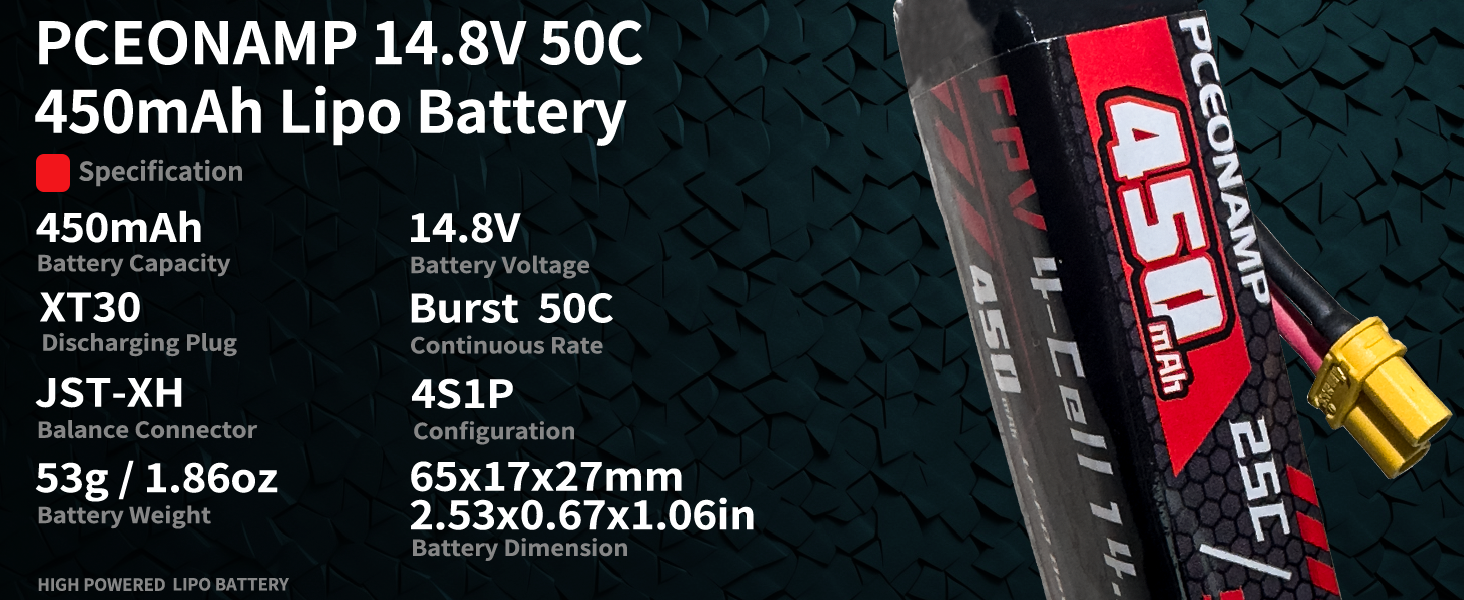 Specification: Dimensions: 65 x 17 x 27mm/2.53 x 0.67 x 1.06in; Weight: 53g/1.86oz; Capacity: 450mAh; Voltage: 14.8V; Discharge C-rate: Burst 50C; Plug: XT30 Plug.