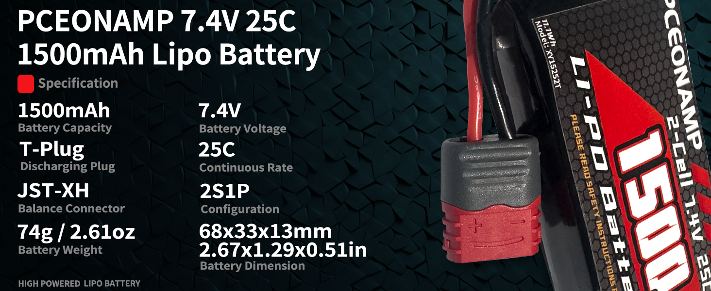 Specification: Dimensions: 68 x 34 x 15mm/2.67 x 1.35 x 0.57in; Weight: 73g/2.57oz; Capacity: 1500mAh; Voltage: 7.4V; Discharge C-rate: 25C; Plug: Deans T Plug.
