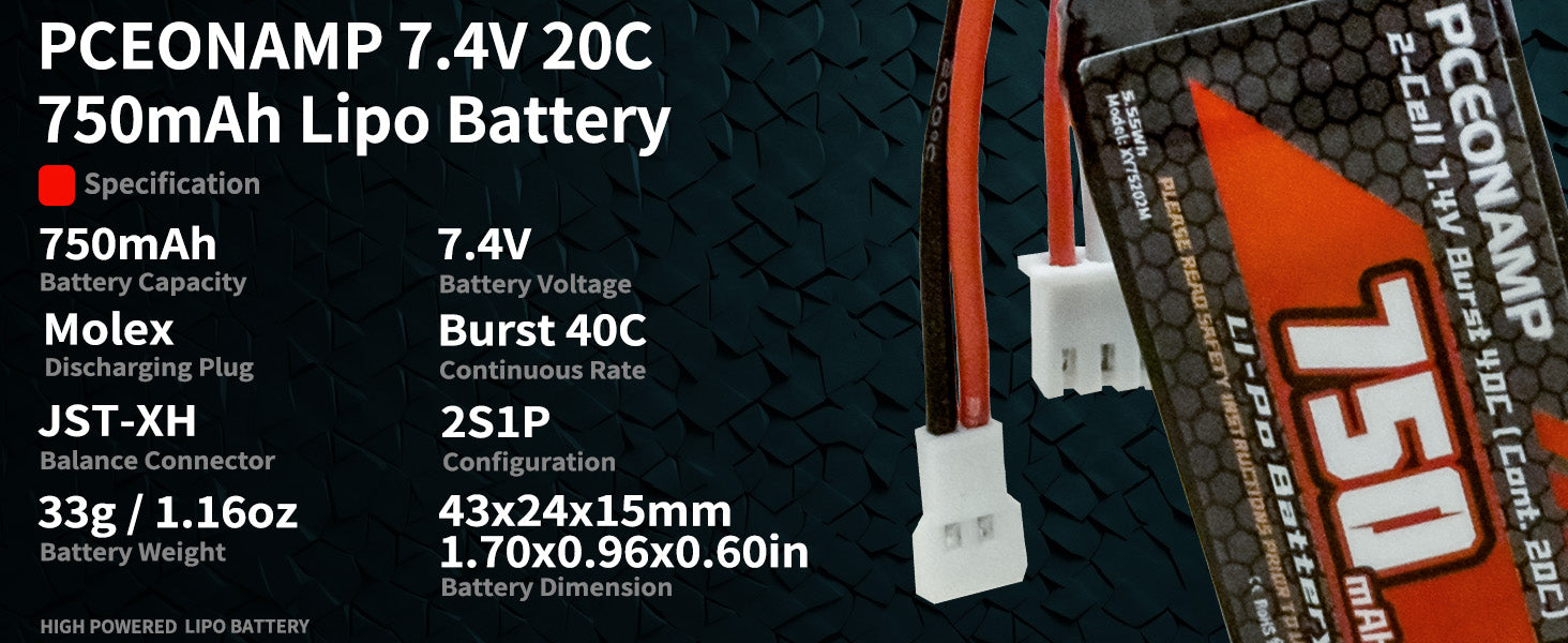 Specification: Dimensions: 43 x 24 x 15mm/1.70 x 0.96 x 0.60in; Weight: 33g/1.16oz; Capacity: 750mAh; Voltage: 7.4V; Discharge C-rate: Burst 40C(Cont. 20C); Plug: Molex Plug.