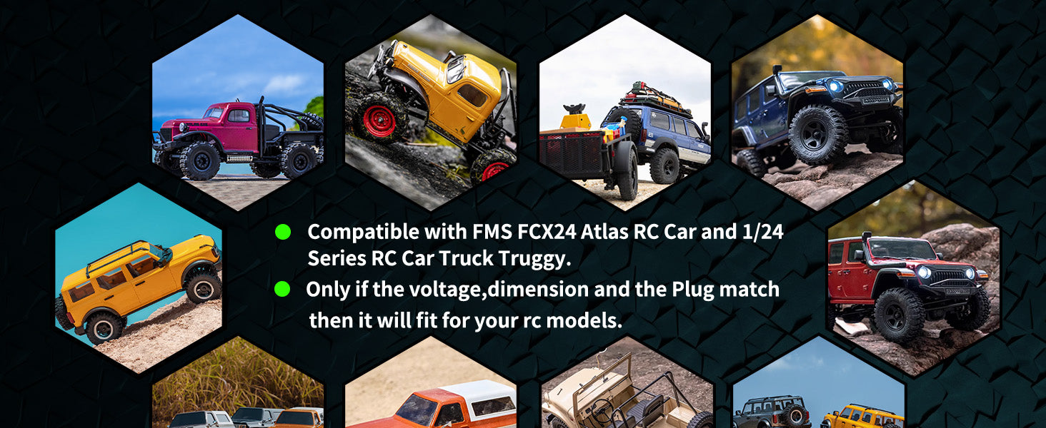 Easy to use: This RC battery is designed to fit in a variety of devices that require a 2S lipo battery, making it a versatile choice for hobbyists. Fit for FMS FCX24 Atlas RC Car and 1/24 Series RC Car Truck Truggy. (Only if the voltage, dimension and the plug match, then it will fit).
