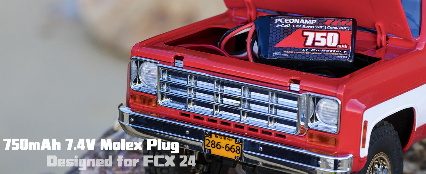 PCEONAMP 2S Lipo Battery 750mAh 7.4V for FCX24 Burst 40C with Molex Plug Rechargeable High Capacity RC 7.4V Lipo Battery Fit for 1/24 Scale RC Cars Trucks with 1 USB Charger (2pcs)