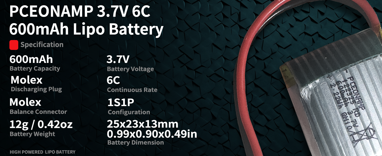 Specification: Dimensions: 25 x 23 x 13mm/0.98 x 0.90 x 0.49in; Weight: 13g/0.45oz; Capacity: 600mAh; Voltage: 3.7V; Discharge C-rate: 25C ; Plug: Molex Plug.