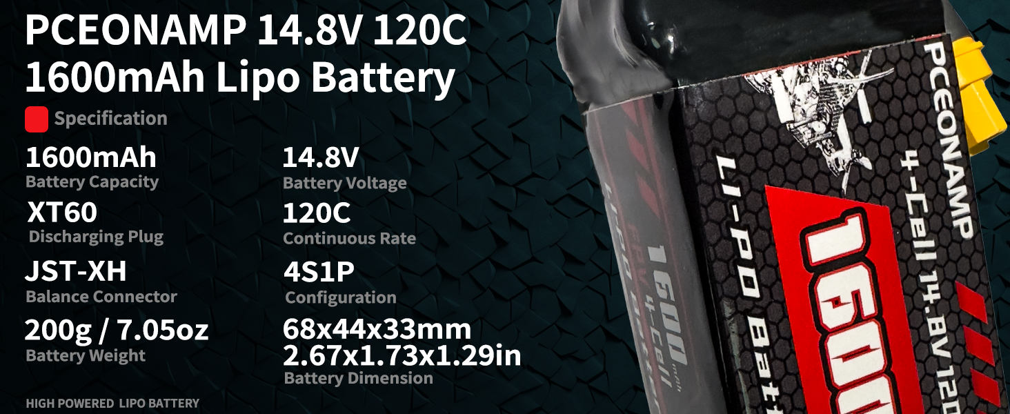 High performance: This 4s lipo battery capacity of 1600mAh is perfect as RC racing Drone battery for long-lasting power. The RC battery delivers superior performance when compared to other 14.8V batteries.