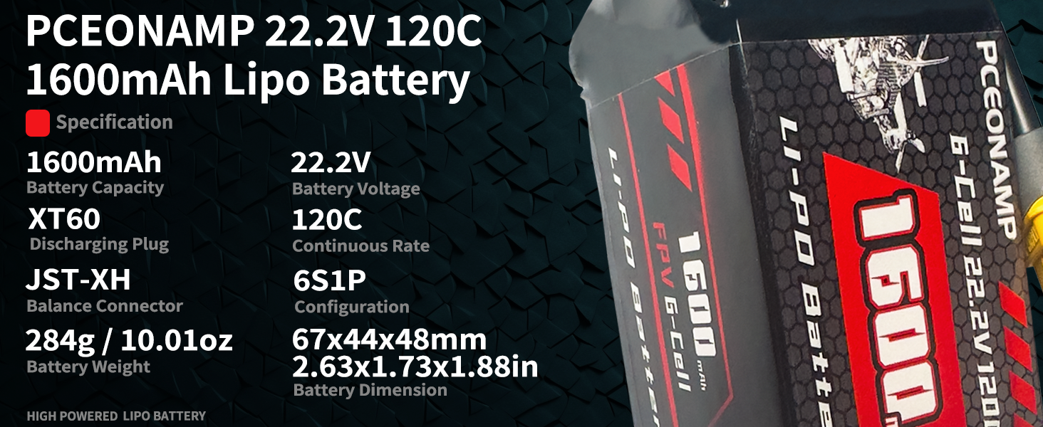 High performance: This 6s lipo battery capacity of 1600mAh is perfect as RC racing Drone battery for long-lasting power. The RC battery delivers superior performance when compared to other 22.2V batteries.