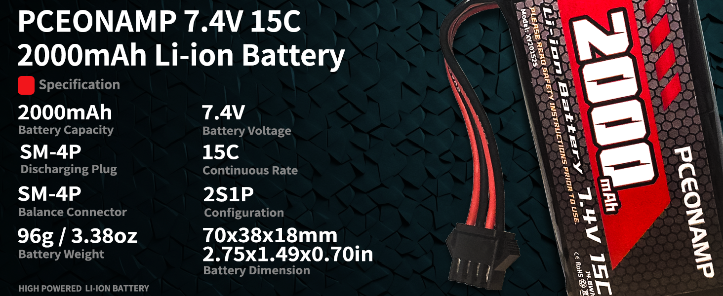 Specification: Dimensions: 70 x 38 x 18mm/2.75 x 1.49 x 0.70in; Weight: 96g/3.38oz; Capacity: 2000mAh; Voltage: 7.4V; Discharge C-rate: 15C; Plug: SM-4P Plug.